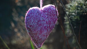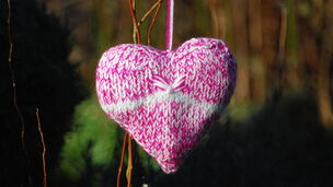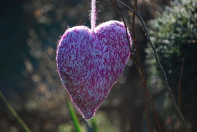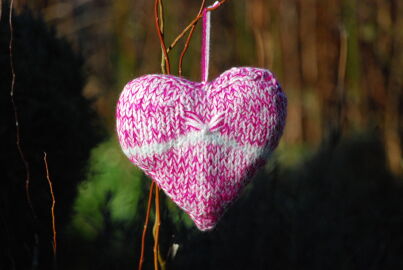 Srdíčka sešijeme k sobě, cca 5 cm před koncem vycpeme a zbytek sešijeme. Mezi obloučky můžeme protáhnout stužku nebo provázek na zavěšení.