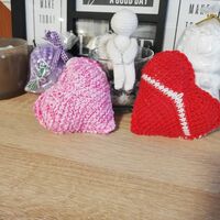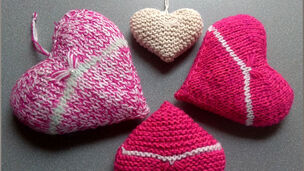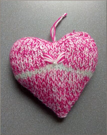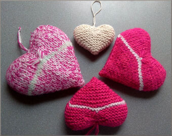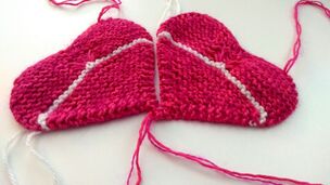 Srdíčka se pletou od obloučků (pomocí německých zkrácených řad) k cípu. Uprostřed srdíčka je jednoduchý vzor, který můžete vynechat. Buď můžete srdíčko uplést 1 x třeba jako podložku, nebo na zavěšení, nebo 2 x - srdíčka sešijeme k sobě a vycpeme.
