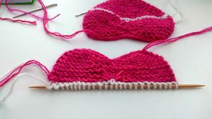1 řada líc: pleteme barvou A - 1hl, 2 oka spleteme za zadní nit (anglicky), 19 hl, k2tog, 1 hl (23 ok)