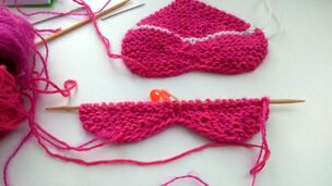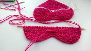 9 řada líc: 12 hl ( čtyři zdvojená oka upleteme hladce), přzn, spleteme oko obrace s nahozeným okem, přzn, 3 hl, kfb, 2 hl, kfb, 1 hl