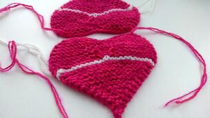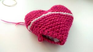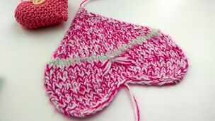 Hotový 1 díl srdce. Srdíčko je pletené lícovým žerzejem s vroubkovým vzorem na okraji.