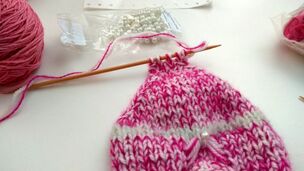 Poslední řada kontrastní barvou. Před pletením můžete navléct korálek, který upletete na prostředním oku při splétání přízí.