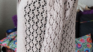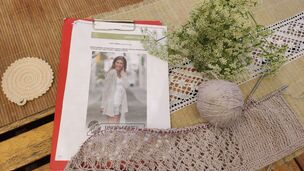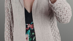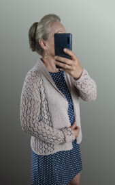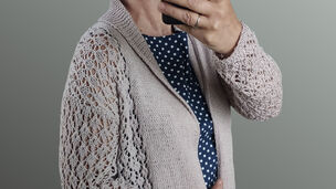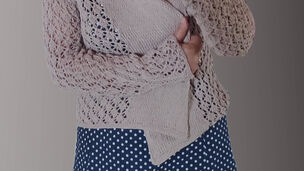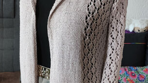 "Kabátek s krajkovým vzorem a šálovým límcem.