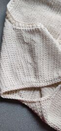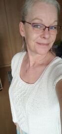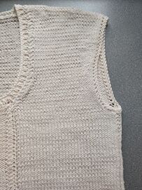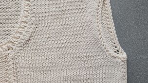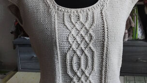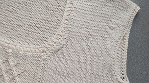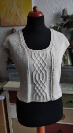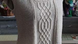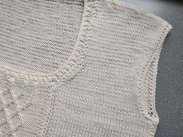 "Vesta je pletená od spodu nahoru přes přední výstřih, zkrácené řady přes rameno, nahozeno na zadní výstřih a zadní díl pletený směrem dolů k patentu. Boky topu jsou sešité.