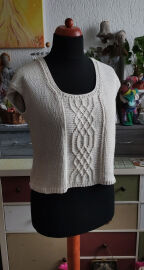 Vesta je pletená od spodu nahoru přes přední výstřih, zkrácené řady přes rameno, nahozeno na zadní výstřih a zadní díl pletený směrem dolů k patentu. Boky topu jsou sešité.