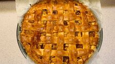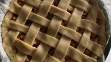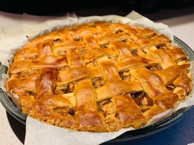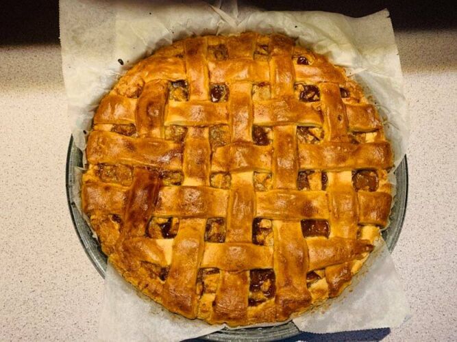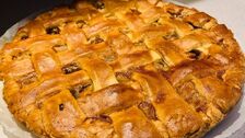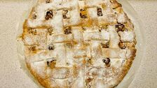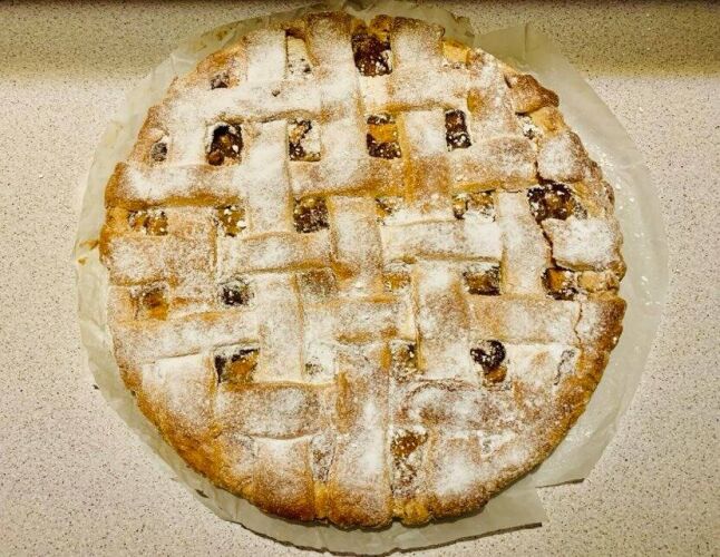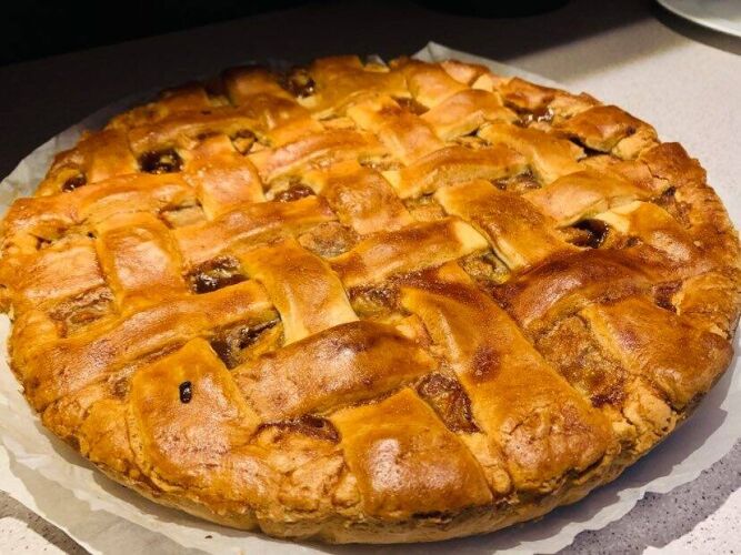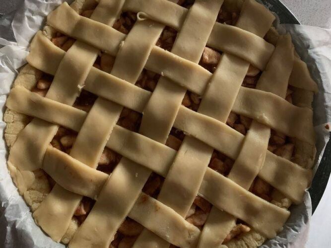 Proužky skládáme na koláč tak aby vznikla mřížka (návod na skládání naleznete v poznámce).