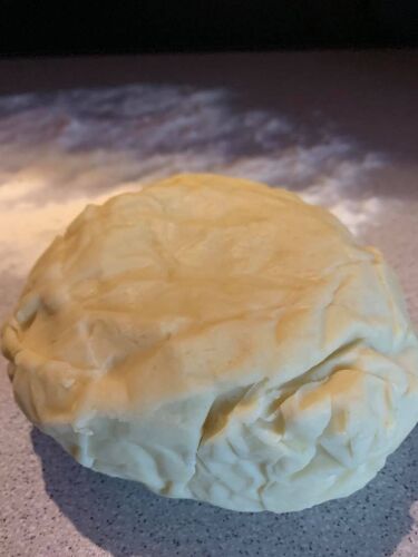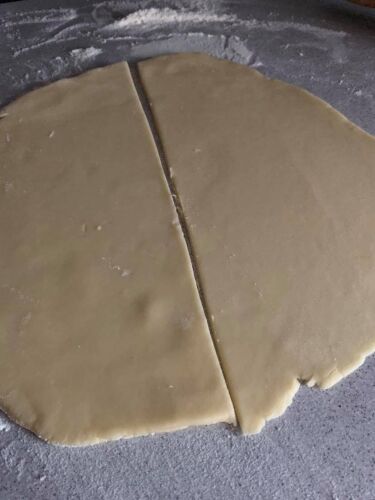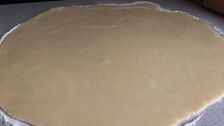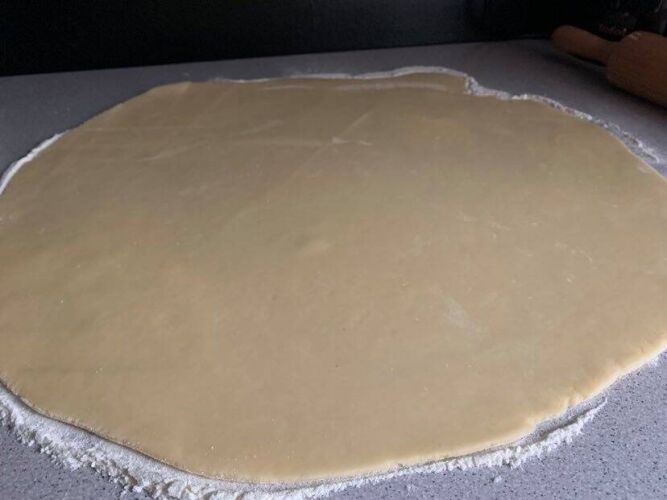 Z větší části těsta na pomoučněném válu vyválíme kulatý plát o průměru větším než je průměr formy. Já jsem použita formu o průměru 31 cm, plát měl průměr 42 cm.