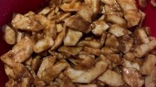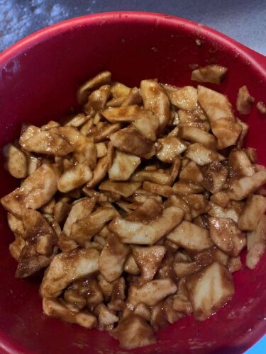 Nakrájená jablka smícháme s cukrem, moukou, skořicí, muškátovým oříškem a citronovou šťávou. Důkladně promícháme.