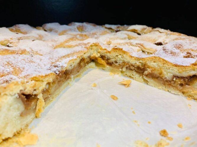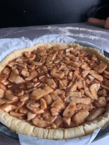 Na těsto rovnoměrně rozprostřeme jablečnou náplň.