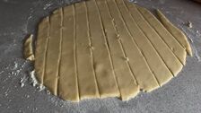 Plát rozkrojíme na dvě stejné poloviny a obě části rozkrájíme na 5 stejně širokých proužků.