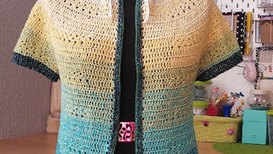 Háčkovala jsem bez návodu, ten jsem vymýšlela v průběhu háčkování. Dvojitý horní lem opatřený šňůrkou pro stažení ke krku. Zip jsem přišila ručně zadním stehem. Lem rukávů je pletený dvojitou přízí (1hl, 1 obr)