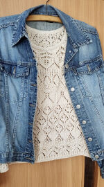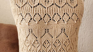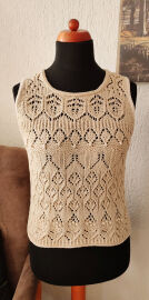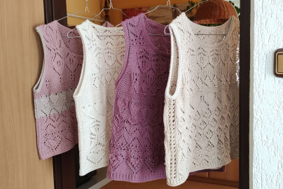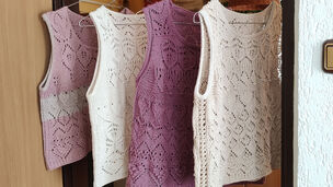 "Horní část se plete shora dolů, nejprve se v řadách plete horní část zad a přední strana a poté se v kruhových okách plete trup. Nakonec se naberou oka kolem výstřihu a průramků pro vytvoření i-cord lemového lemování. Upravila jsem jen některé vzory oproti originálu."